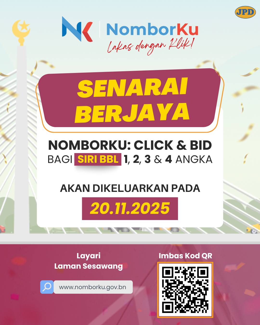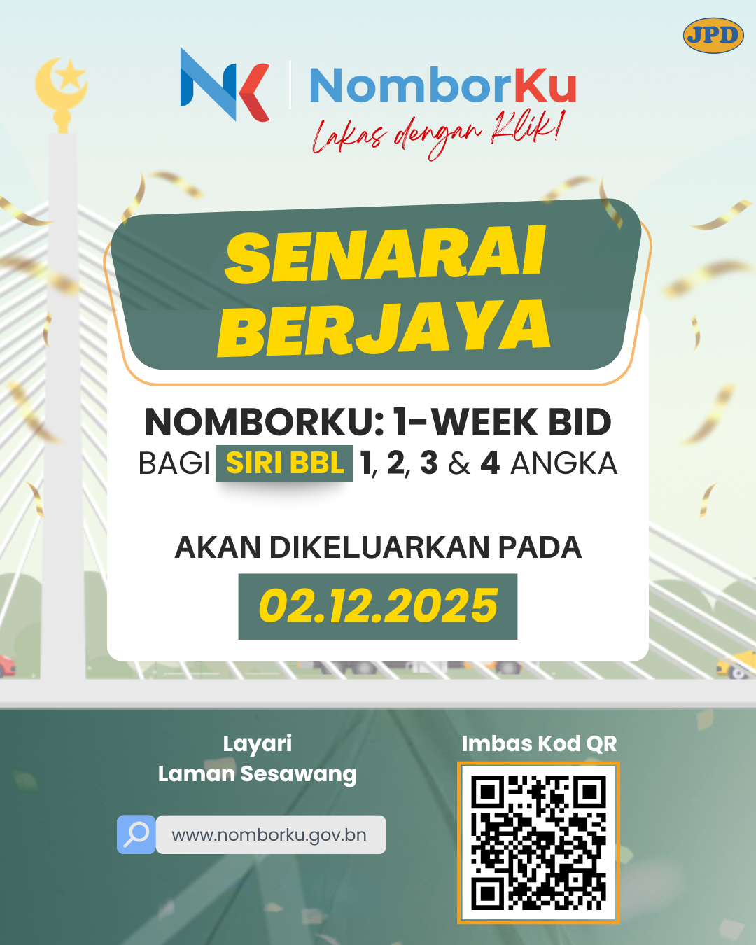 Jabatan Pengangkutan Darat (JPD), Kementerian Pengangkutan dan Infokomunikasi (MTIC) ingin memaklumkan orang ramai bahawa keputusan Tawaran Tertutup Tanda Pengenalan Kenderaan (TPK) bagi satu (1), dua (2), tiga (3) dan empat (4) angka Siri BBL melalui 1-Week Bid akan diumumkan melalui laman sesawang NomborKu: www.nomborku.gov.bn pada hari Selasa, 2 Disember 2025.